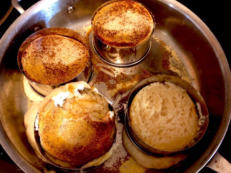For four fat English muffins: warm up 1 ½ cups of milk to about 100 degrees, and add 1 ½ tsp dry yeast, let it proof for two minutes. Stir in 1 Tbsp melted butter and 2 Tbsp maple syrup. In a bigger bowl, mix 2 cups flour with ½-1 Tbsp salt (the recipe called for 1 Tbsp, which was aggressive, but it’s your call), then incorporate your wet ingredients into your dry ingredients and let rise in a warm place for about 40 minutes. Heat up a skillet on medium, sprinkle cornmeal generously on the bottom of the skillet, drop in your four big (3.5-4”) cookie forms, and spoon dough into each. Cook for about 10 minutes each side. Good luck flipping them! You may have to do a lot of cautious scraping and nudging.