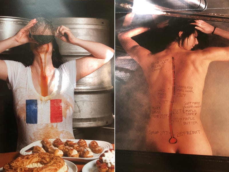 That case is somewhat undermined (if you do not enjoy traditional leering male chauvinism) or supported (if you do enjoy traditional leering male chauvinism) by the book’s artistic sensibility. Men, when they appear in its pages, are generally well into middle age, stocky, fully clothed, and doing things like writing menus, tapping maple trees for syrup, or cooking food. Women, when they appear in its pages, are generally in their early 20s, soaking their T-shirts in maple syrup, bending over while wearing a bikini, or appearing tastefully nude with various maple candy-related facts inked onto their backs.
