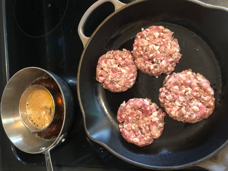 For seven robust sausage patties, mix together in a plastic bag: .75# each of pork shoulder and pork belly cut into 1-¼ inch cubes; 2 ½ Tbsp maple syrup; ½ tsp each of sea salt and ground pepper; 1 tsp each of chopped fresh sage, thyme, and rosemary; and a pinch each of grated nutmeg, cayenne pepper, and red pepper flakes. Let this sit overnight, then grind it twice through a meat grinder using a ¼ inch / 7mm plate. Shape it into 6-10 patties using a small bowl or big cookie cutter. Refrigerate those patties on a sheet of parchment paper for 1 hour, then cook through on a skillet, about 5 minutes each side.