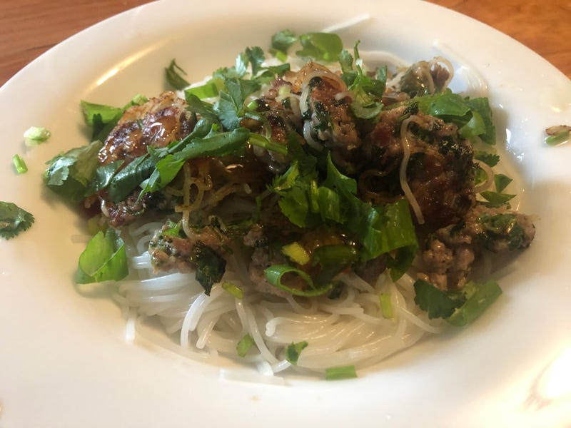 Because I bought a one-pound increment of ground pork, I ended up scaling the filling up by 25% and using the excess to make incredibly tasty meatballs that I sauteed in oil and served on rice noodles with chopped scallions, cilantro, and a bit of chili sauce and hoisin (above).