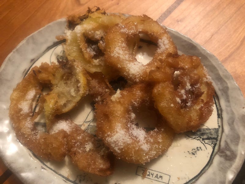This mixed fry-up is surprisingly light, delicate, and bright thanks to the liberal use of lemon sugar. The fried apple rings actually resemble apple cider doughnuts but are considerably more nimble and bright, while hit much the same sweet spot. And the peels are one of the best parts of this recipe, as they're a crispy, crunchy, chewy textural delight. The lemon slices had a bit of a tough rind when we tried them but the intense, delightful kick of citrus that their interiors provided more than compensated for the textural challenge.
