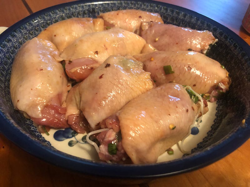 I’m sort of a sucker for anything-stuffed-with-anything recipes (up to but not including the highly overrated Turducken, which really defeats the purpose of roasting and eating celebratory birds.) So when I spotted Thielen’s Asian-inflected pork-stuffed chicken thighs recipes, I knew I had to try it.