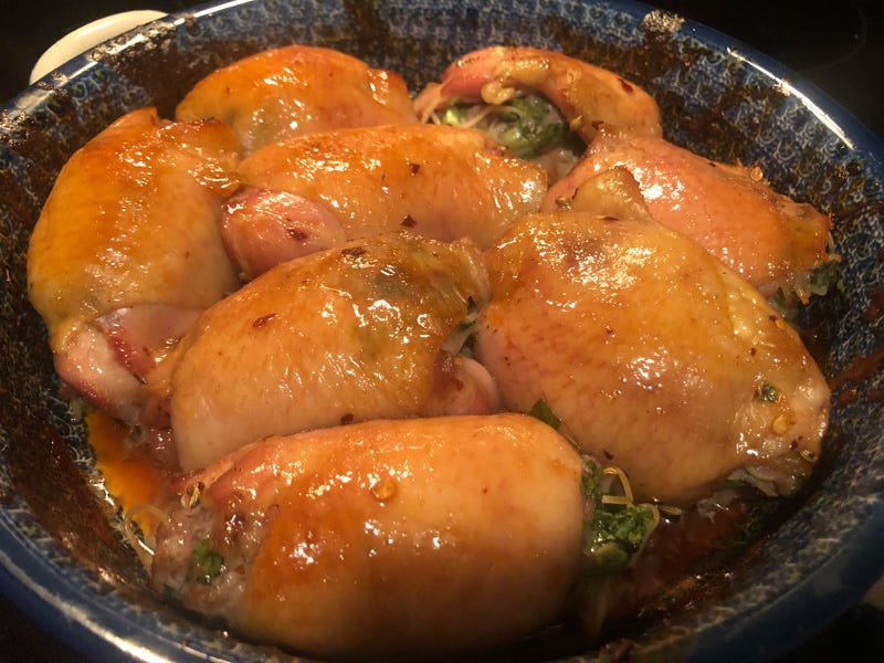 At this point, the juices will have begun to seep from the chicken; carefully tip up the pan and spoon the collected juices back into the marinade. Bring the marinade back to a boil, then brush the chicke with another thick coat of it and roast for another 10 minutes. Brush the thighs one more time with the marinade, using all of it, and continue to roast until the skin is deeply caramelized and the pork filling inside the chicken runs hot and clear when piercved with a fork, another 10 to 15 minutes (for a total of 35 minutes in the oven.)