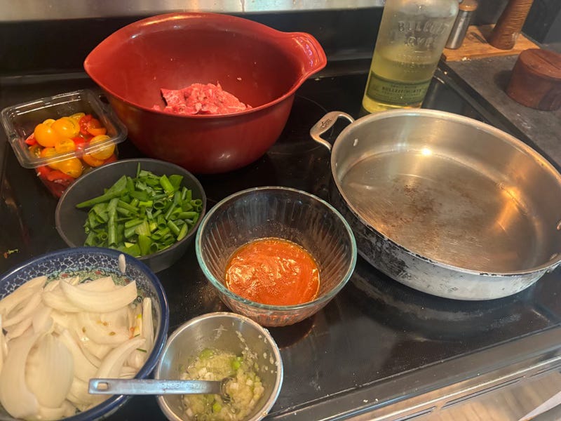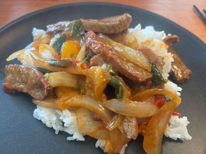 All you really need to know about this dish is that it's a pretty good beef stir fry. Possibly an excellent beef stir fry? My kids absolutely loved it, and I had to admit that the dish provided a lot of balanced flavor by marinating the beef, hitting the pan with a concentrated BAM!-style glop of ginger, garlic, and scallions, and then blasting everything with a pretty decent ketchup-based sauce.