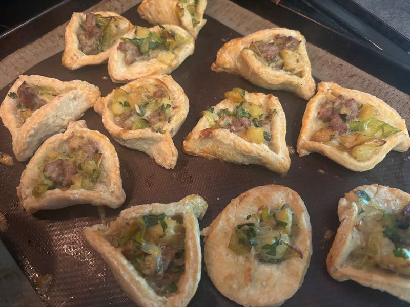 Oh Christ. Never mind. They're savory hamantaschen, OK? Stuffed with bits of sausage, potatoes, and a leek gravy.