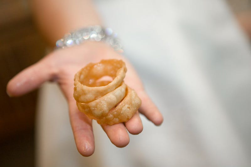 BECCA DILLEY: Scalidi as I know them are an Italian cookie that we only make at Christmas time. It's a complicated process - it's an enriched dough that you wrap around a wooden dowel and then slowly roll out so it becomes very thin, almost like a pasta sheet, but in a circle. It's a big tube with slits in it.