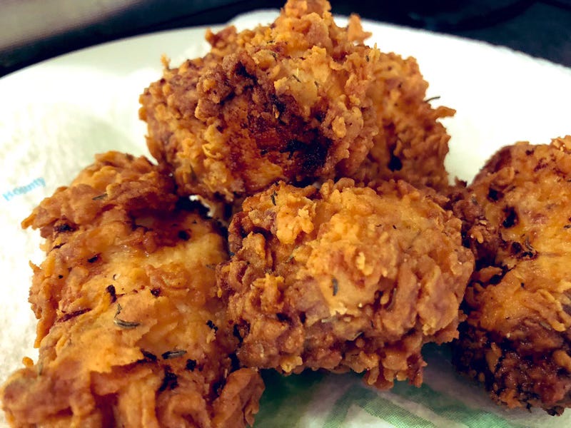 Turn chicken and fry on other side until golden brown, about 6 minutes, maintaining an oil temp of about 315.
