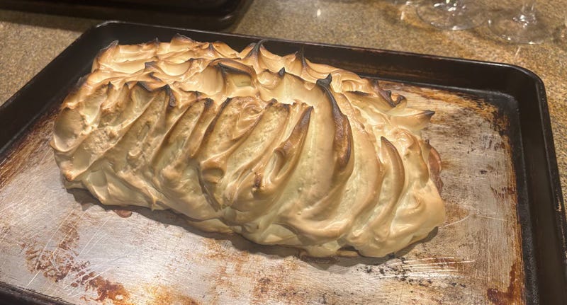 This is one of the great all-time semi-extinct American classic desserts. I’m sure it’s semi-extinct because it’s a royal pain in the ass to construct. You need to saw up cardboard cartons to make a cylinder of ice cream, bake a huge, pliable sheet of sponge cake, measure out the dimensions to enrobe and cap your ice cream cylinder, bring a meringue to stiff peaks, ice your cake log, and then broil the sucker before service. It would take a handsome price tag indeed to make this leviathan worth the effort in a restaurant kitchen, and it’s nearly unworkably challenging in a home kitchen.